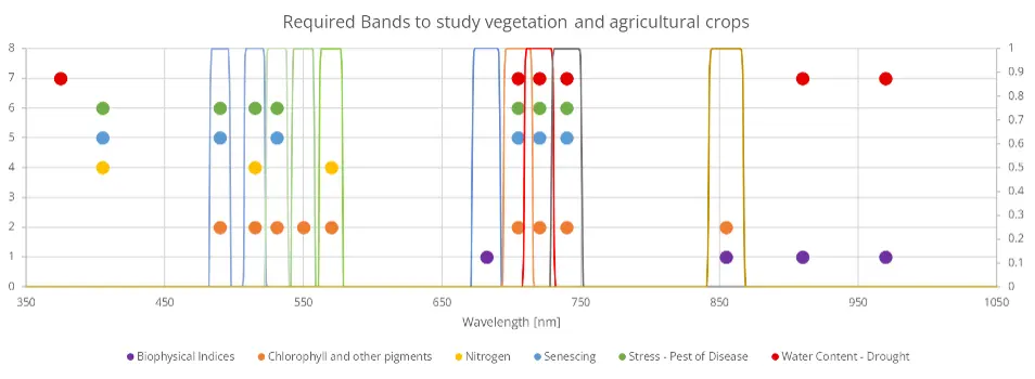 | Early N stress | Red-edge position and slope | Red-edge indices (NDRE-style) | Multiple bands across 700–740 nm allow tuning to cultivar and soil background. |